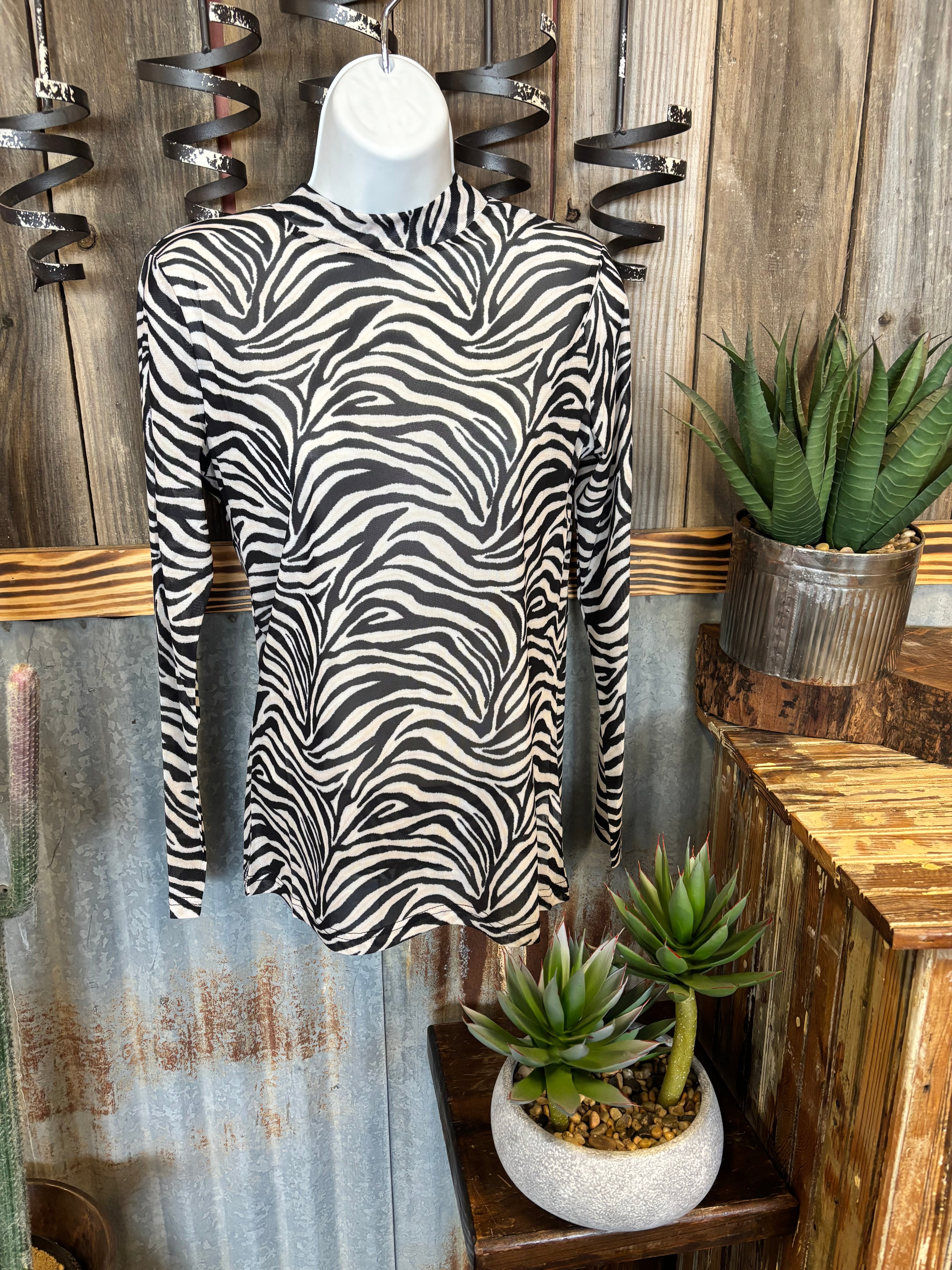 Step out in style with the Cowgirl Safari Mesh Top, featuring a bold black and white zebra print. This lightweight mesh design adds a fun, wild edge to your outfit while keeping things breezy and comfortable. Perfect for layering or wearing solo, it brings a playful spirit to any wardrobe.