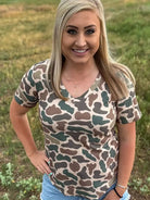 This camo v-neck top is where rugged meets refined. Featuring a mix of earthy brown, forest green and classic tan in a bold camo print, this tee brings the outdoors to your everyday look. The flattering v-neckline gives it a feminine edge, while the relaxed fit keeps it comfy for all-day wear whether you're running errands or running the show.